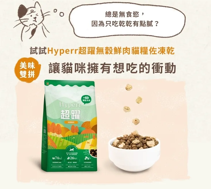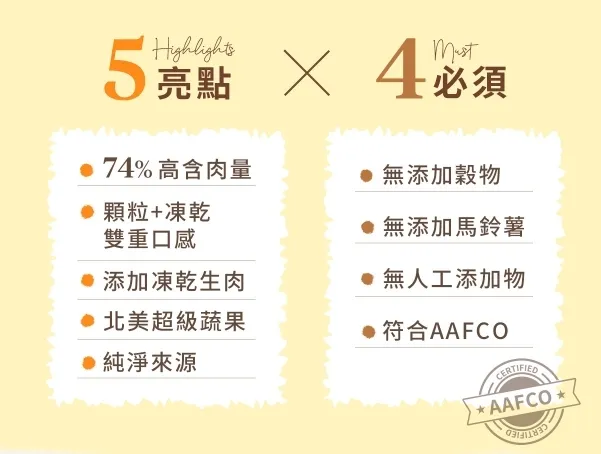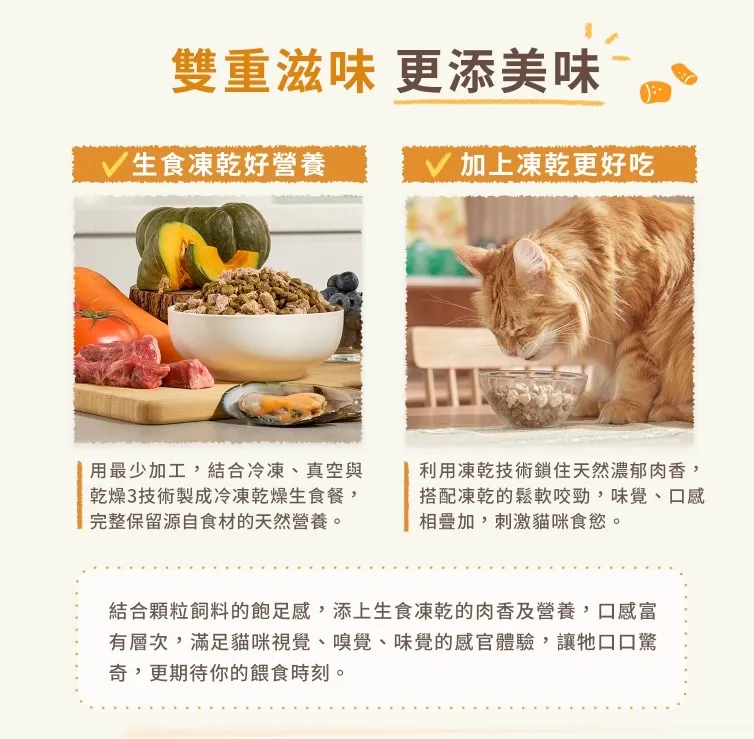 顆粒飼料+凍乾,雙重顆粒MIX,食感體驗升級!74%高含肉量的基底飼料,採新鮮肉塊佐當季蔬果,無穀無人工添加物,搭配單一雞肉凍乾,低脂高蛋白,適口性首選