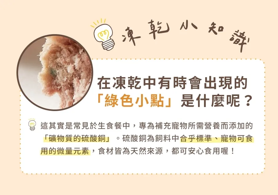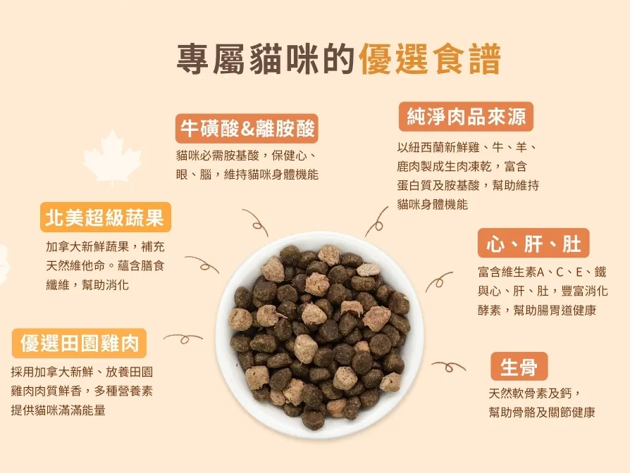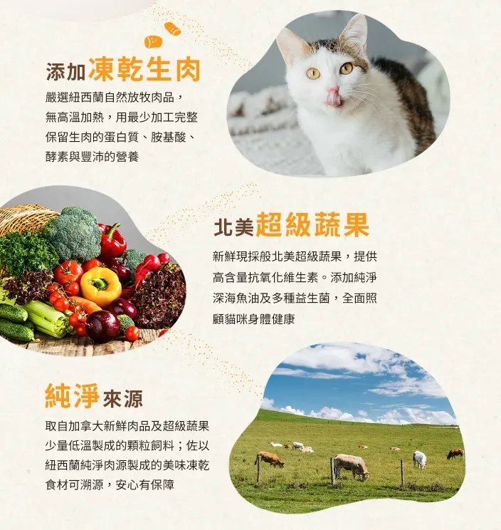 凍乾飼料成分:羊肉、羊骨、羊心、羊肚、羊肝、綠唇貝、麥蘆卡蜂蜜、膽鹼、維生素B1、維生素B2、維生素B5、維生素B6、維生素B12、維生素D3、維生素E、菸酸、D-生物素、葉酸、硫酸銅、硫酸亞鐵、氧化鎂、硫酸錳、氯化鉀、檸檬酸鉀、檸檬酸鈉、硫酸鋅、牛磺酸、硒、碘化鉀