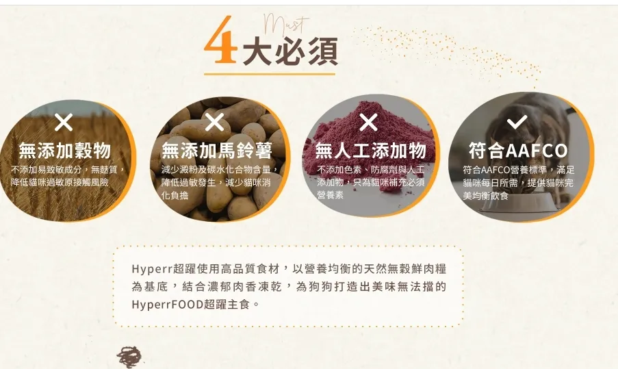 顆粒飼料成分:新鮮雞肉、雞肉粉、豌豆、紅扁豆、雞油、豌豆蛋白、天然香料、苜蓿粉、魚油、丙酸鈣、鹽(氯化鈉)、氯化膽鹼、牛磺酸、氯化鉀、離氨酸、蛋氨酸/DL、維生素 A、維生素 D3、維生素 E、菸酸、泛酸鈣、核黃素、單硝酸硫胺素、鹽酸吡哆醇、葉酸、維生素 B12、生物素、甲萘醌、硫酸鋅、硫酸亞鐵、鋅蛋白、鐵蛋白、硫酸銅、氧化錳、銅蛋白、錳蛋白、碘酸鈣、亞硒酸鈉、迷迭香萃取物、蘋果、藍莓、胡蘿蔔、菠菜、番茄、蔓越莓、青花菜、南瓜、香蕉、益生菌(嗜酸乳桿菌發酵物、乾酪乳桿菌發酵物、雙歧桿菌發酵物、糞腸球菌發酵物)