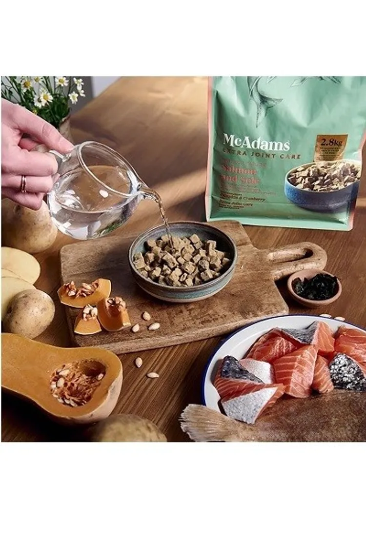 符合永續採購的鮭魚60%、符合永續採購的黄金鲽魚20%、南瓜5%、馬鈴薯澱粉4.6%、樹薯澱粉4.4%、蔓越莓2%、菊苣根粉0.8%、葡萄糖胺硫酸鹽1,500毫克/公斤、硫酸軟骨素1,500毫克/公斤、海藻0.1%、絲蘭0.1%、綠茶萃取物0.01%、維生素與礦物質。