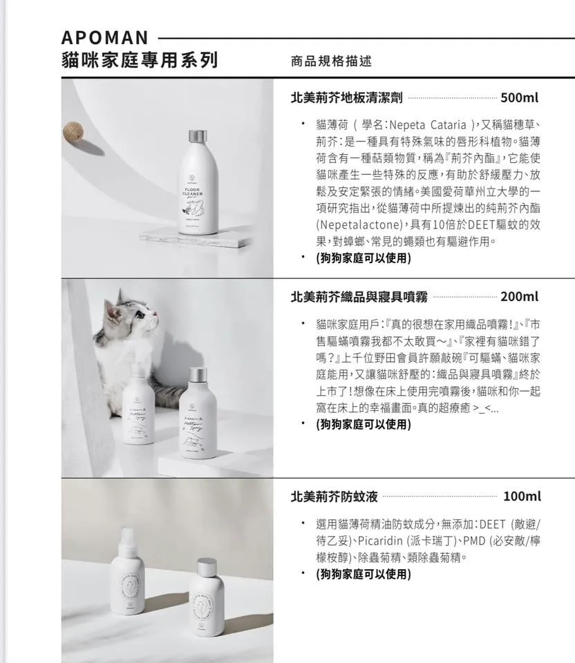 野田實驗室的團隊花了一年,測試來自多個產地的貓薄荷精油,最終選定來自美國的「北美荊芥」。這支精油含有高比例荊芥內酯,為原裝進口,品質穩定,是我們這次配方的關鍵角色。這是一款為毛孩家庭設計的清潔劑,也是一支我們自己會想每天使用的作品。